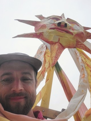 (he/him/they/them) is a local artist, activist and poet who strives to create work that inspires joy, wonder, deep connection and liberation. From large-scale murals, banners, flags and protest signs to astrological woodcuts, freestyle poetry and upcycled clothing, erok offers a big and tiny array of artwork. Erok has been print making for over 20 yrs working in DIY styles of both screen and block printing. Often he's working with community to make prints and art used in parades, protests and campaigns for climate justice and human rights.